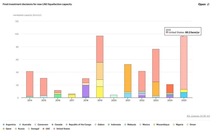 👆Предложение СПГ на мировом рынке в ближайшие годы будет быстро расти. Общемировые поставки СПГ в 2025м году составили 429 млн тонн (+4% г/г), но в 2026-2028 годах мощности по сжижжению прибавят 145 млн тонн в год (+34% к 2025 году). В основном это проекты в США и Катаре (подробнее об этом писал здесь). При этом, инвестиции в проекты по сжижению продолжают расти (см. скриншот), а как идет борьба с конкуренцией на рынке энергоресурсов мы прекрасно видим на примере нефтянки.