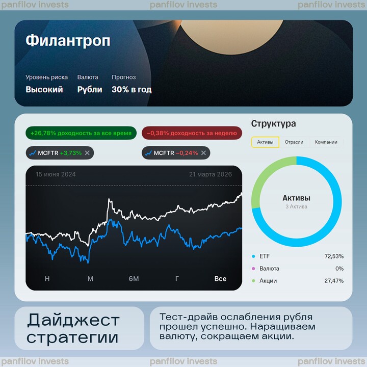Всю прошедшую неделю я потирал руки и думал, какими словами на этот раз я буду хвалить свою стратегию [&Филантроп](https://www.tbank.ru/invest/strategies/c4896e28-692b-4f93-88e2-9b2c447d1d45) , потому что в четверг она закрывала день с преимуществом в 1,5% перед индексом.