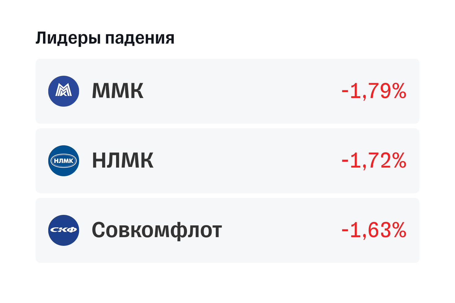 Падения. В списке падений из индекса Мосбиржи: ММК, НЛМК, Совкомфлот.
