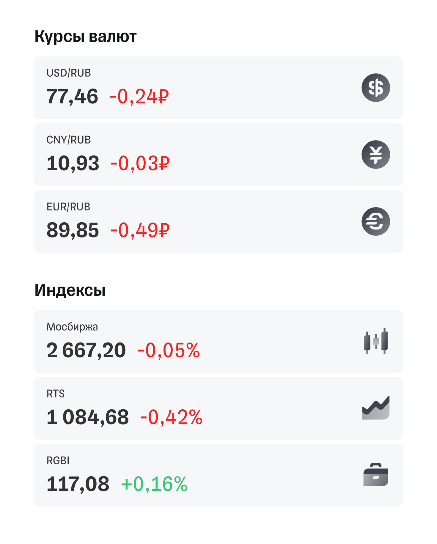 Индекс Мосбиржи закрыл основную сессию в красной зоне. Индекс гособлигаций прибавил 0,16%. Российская валюта продолжает укрепляться: 77,4 рубля за доллар и 89,85 рубля за евро.